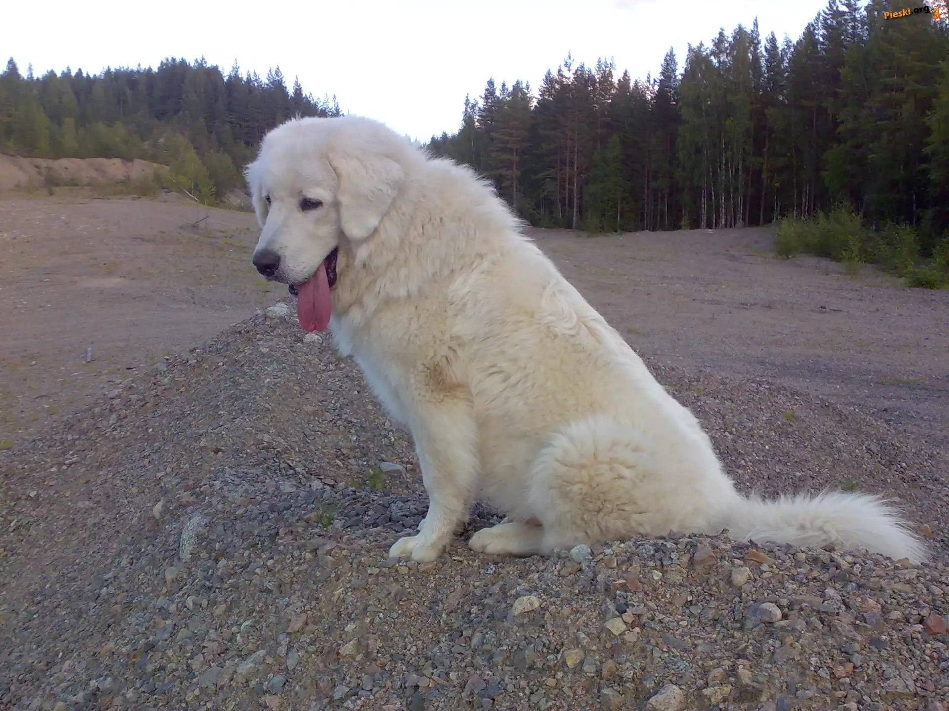 Biały, mały, piesek Trawa, Dwa, Pieski, Niebo Mordka, Polskiego owczarka podhalańskiego skórzana, Głowa, Owczarka podhalańskiego, obroża Pies, Owczarek Podhalański Biały, Polski owczarek podhalański, język czerwona, Owczarek podhalański, zęby, obroża Owczarek podhalański, zielona, trawa