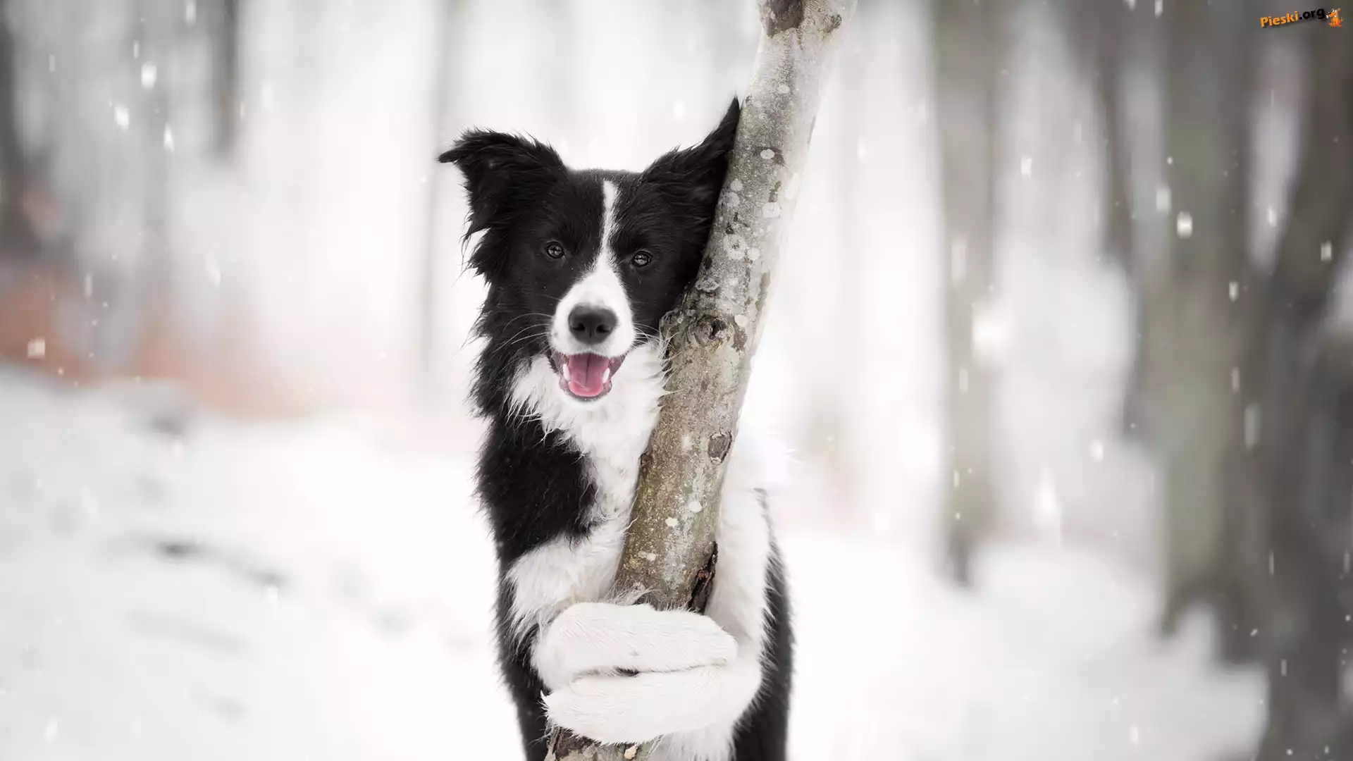 Drzewo, Border collie, Pies, Mordka, Śnieg , Pieski