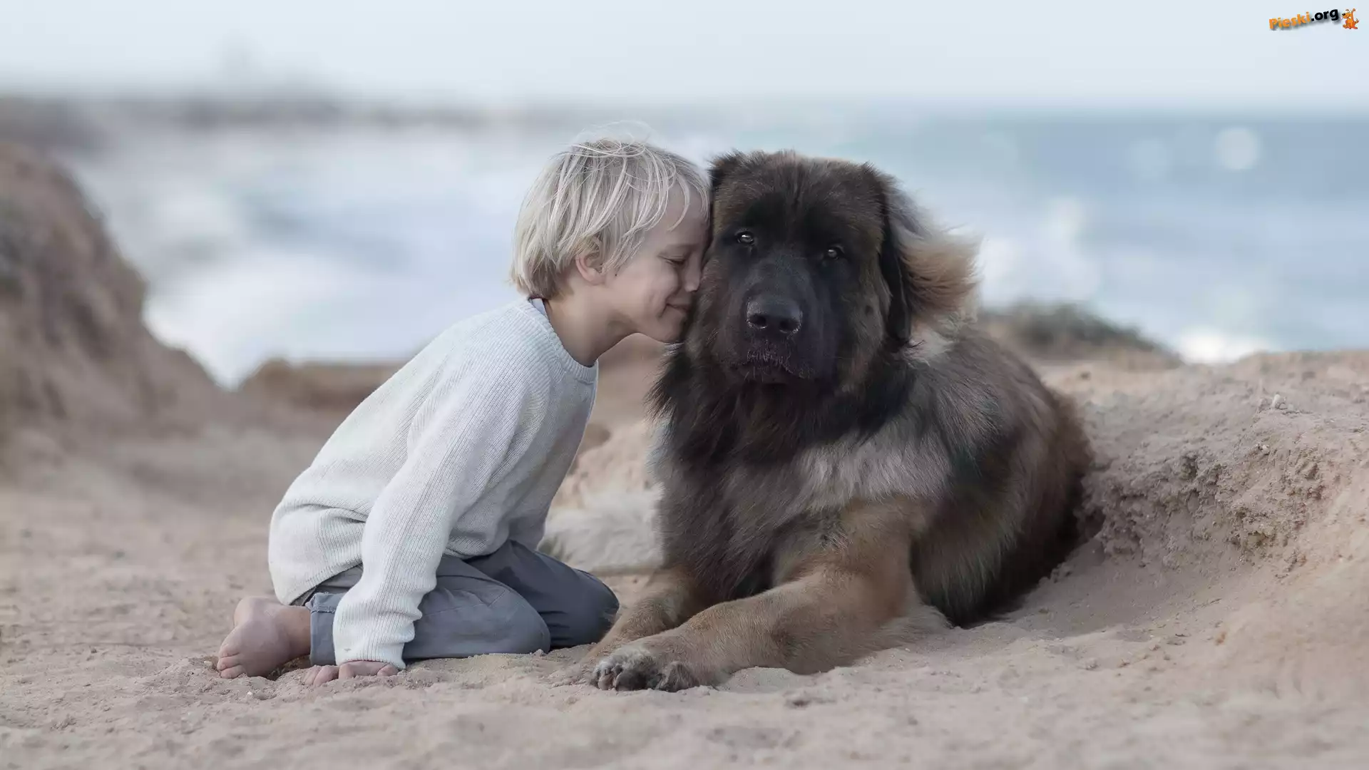 Przyjaciela, Dziecko, Plaża, Pies, Chłopiec, Leonberger, Piasek, Pieski