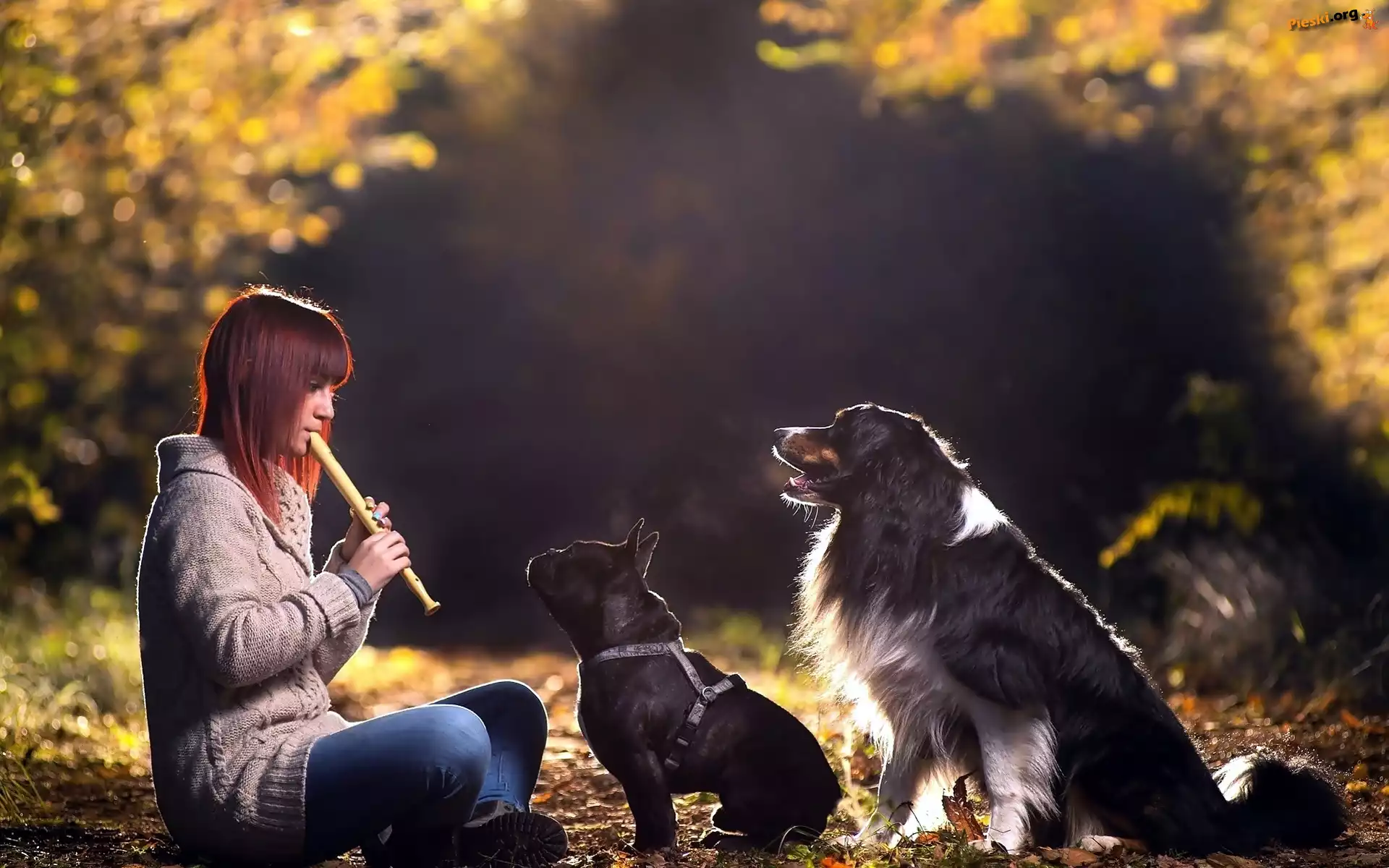 Droga, Dziewczyna, Las, Zasłuchane, Flet, Psy, Jesień, Pieski
