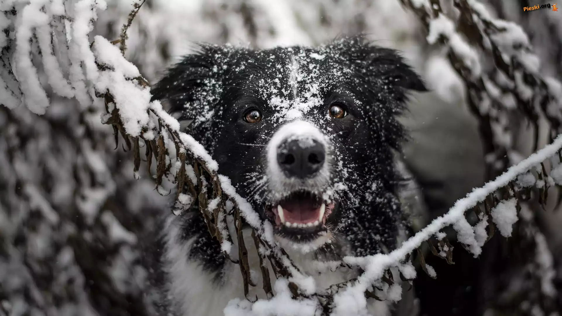Gałązki, Border collie, Pies, Mordka, Śnieg, Pieski