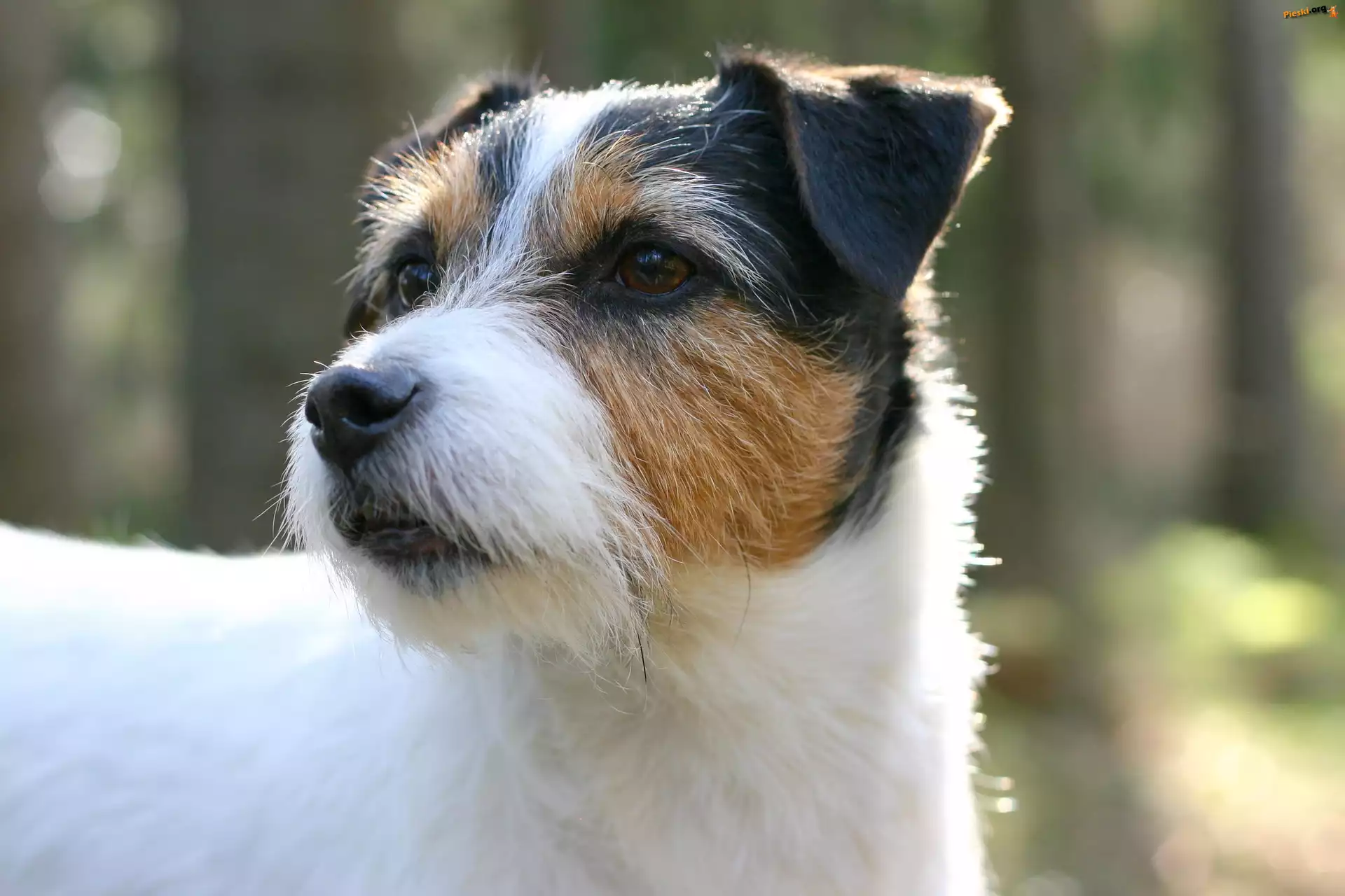 Domy, Ubranko, Parson Russell Terrier Parson Russell Terrier, most Parson Russell Terrier, Las Polana, Chłopiec, Mały, Szczeniaczek, Las głowa, Parson Russell Terriera