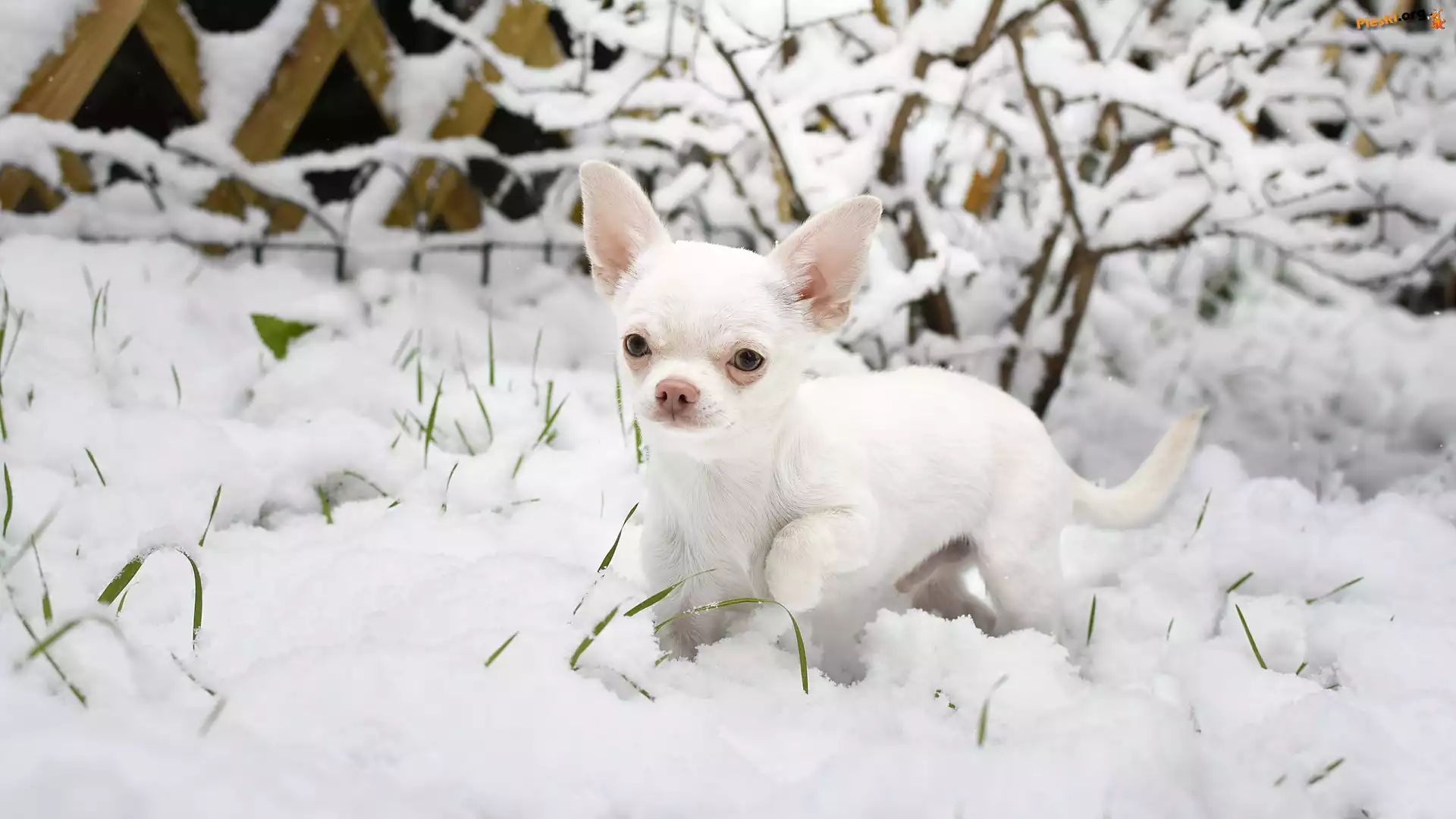 Śnieg, Pies, Chihuahua krótkowłosa, Krzew, Pieski