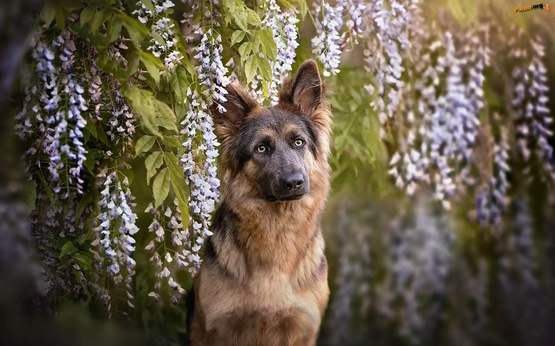 Glicynia, Kwiaty, Pies, Owczarek niemiecki, Pieski