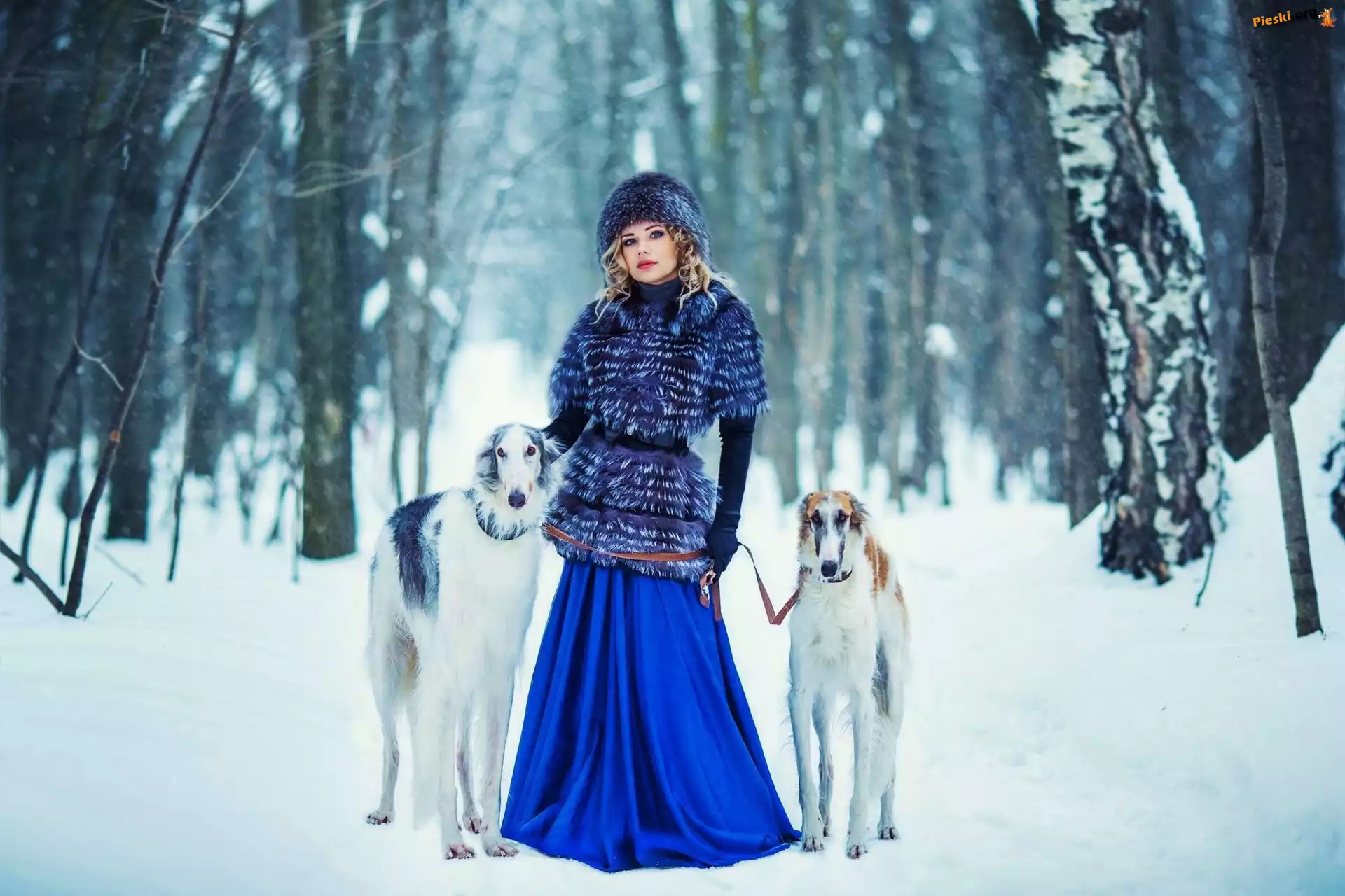 Las, Kobieta, Psy, Śnieg, Pieski