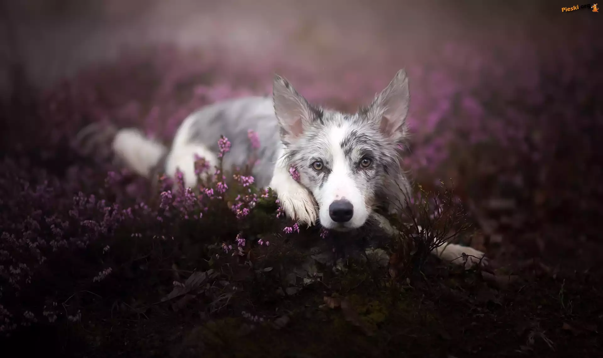 Leżący, Border collie, Wrzos