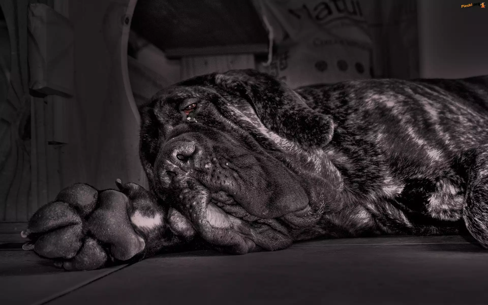 Mastif, Odpoczynek Morda, Mastifa neapolitańskiego Mastif neapolitański, czerwona, obroża Mastif neapolitański, Pies, Szczeniak, Fotel Pies, Mastif, Neapolitański Mastif neapolitański, szare, umaszczenie