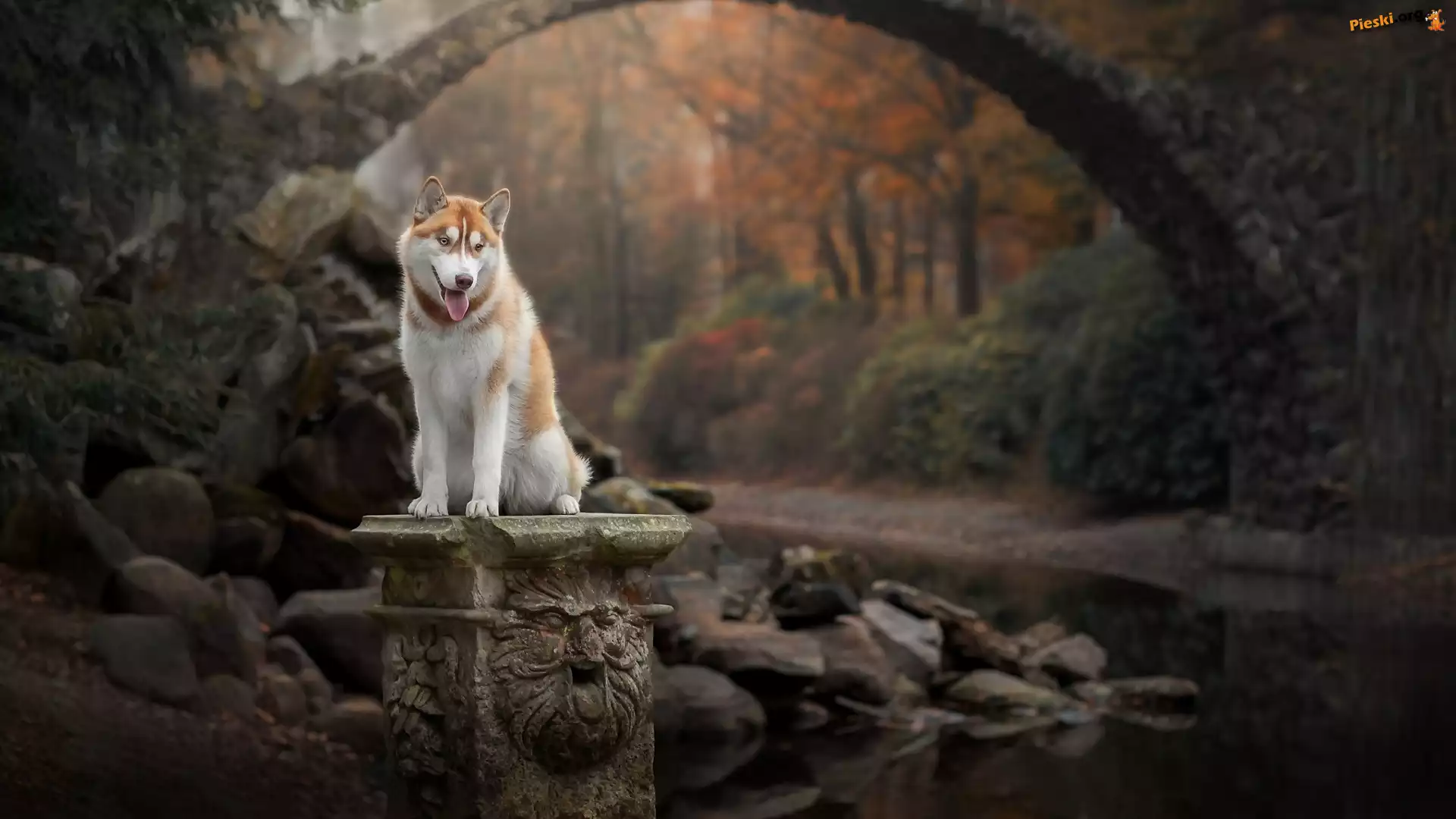 Pies, Mostek, Kamienie, Siberian husky, Postument, Potok, Pieski