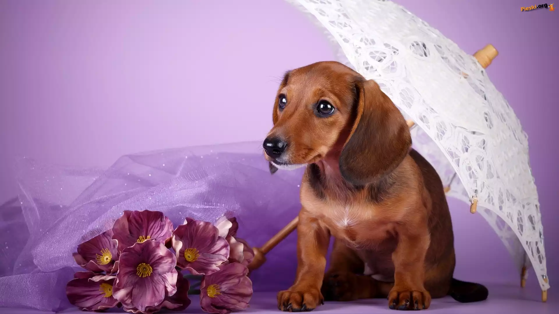 Parasolka, Pies, Jamnik krótkowłosy, Kwiaty