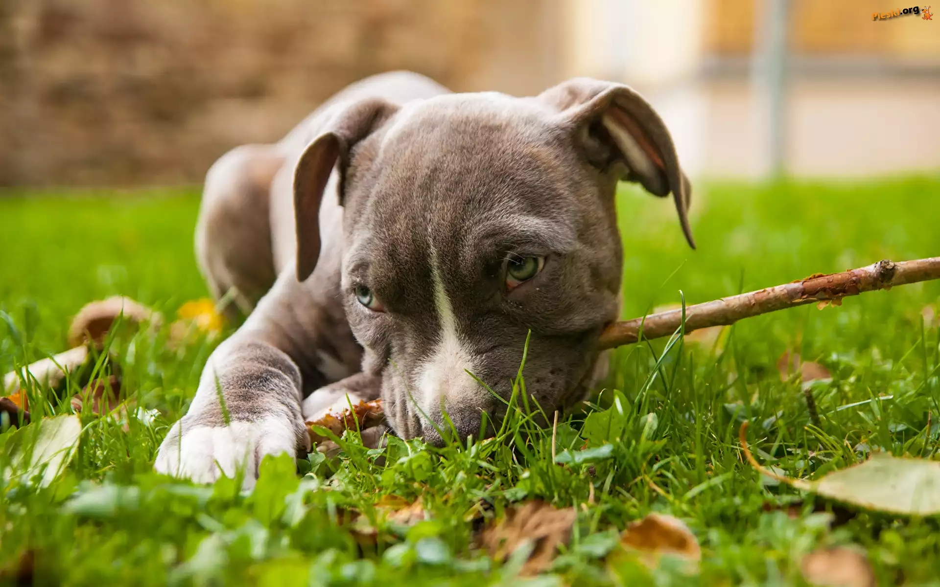 Trawa, Pies, Liście, Łąka, Amerykański staffordshire terier, Szczeniak, Amstaff, Patyk, Pieski