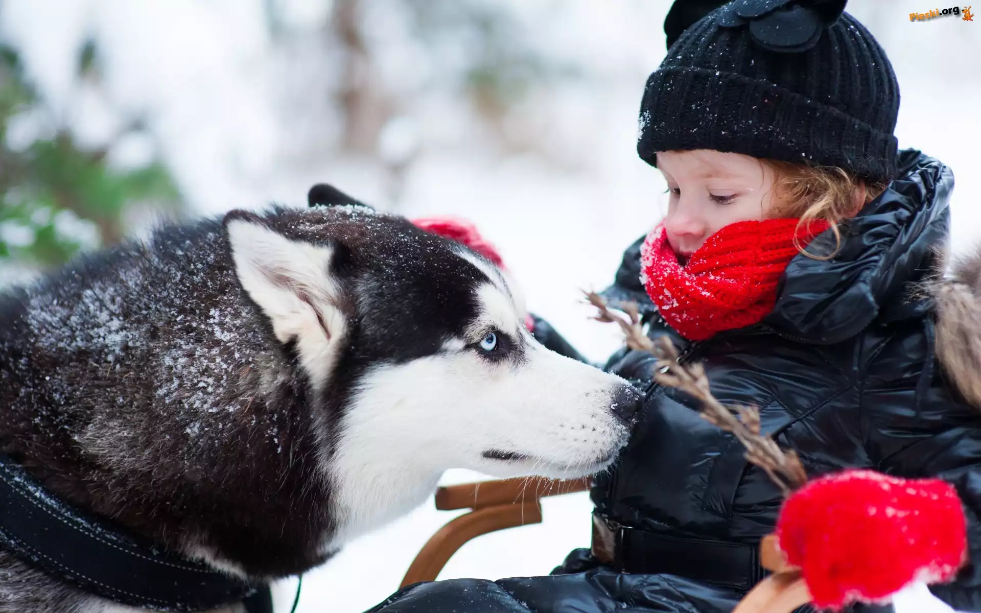 Pies, Zima, Dziecko, Gałązka, Siberian Husky