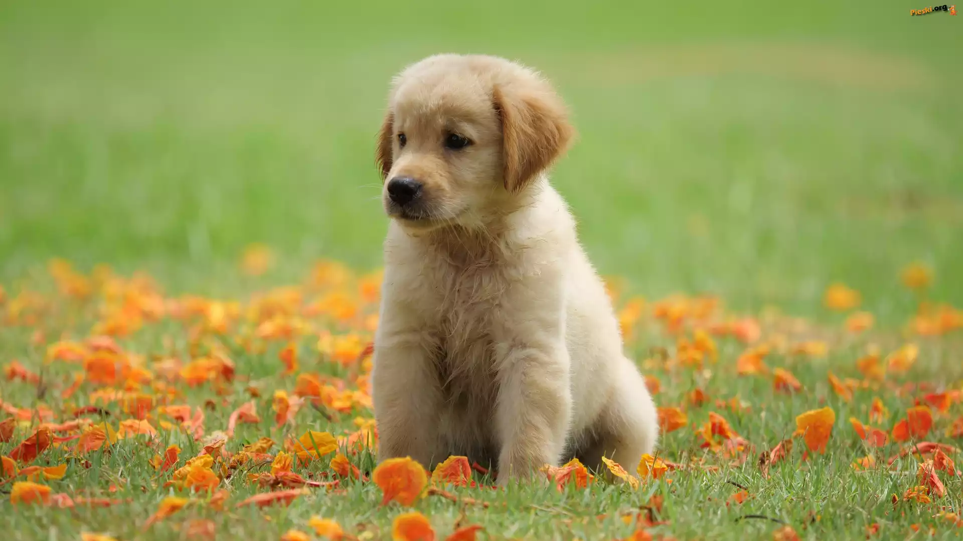 Łąka, Szczeniak, Golden retriever, Liście, Pieski
