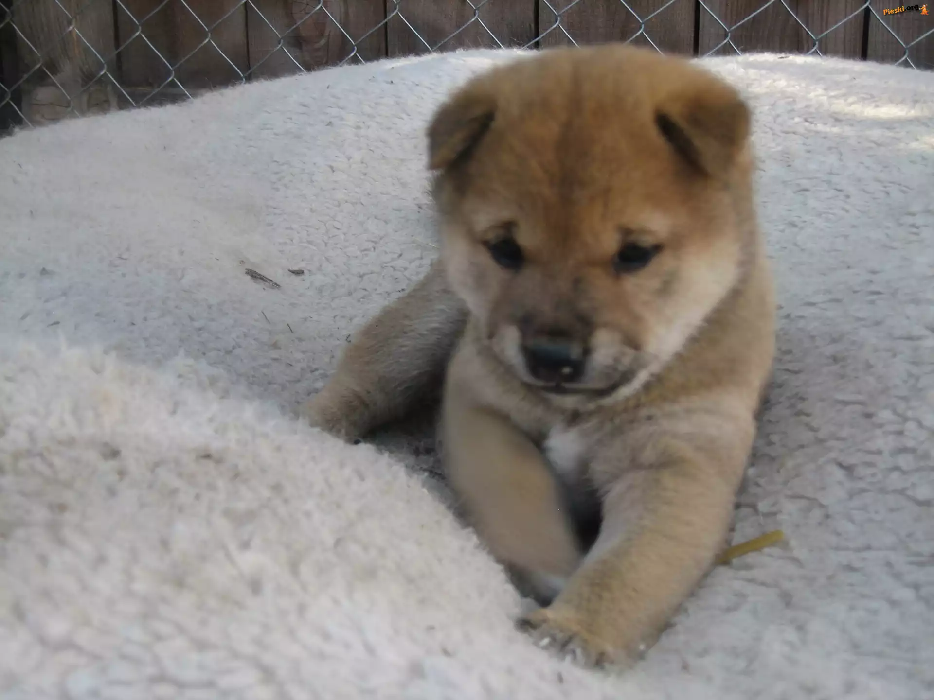 Shiba inu, słodki, szczeniak, płot, Pieski