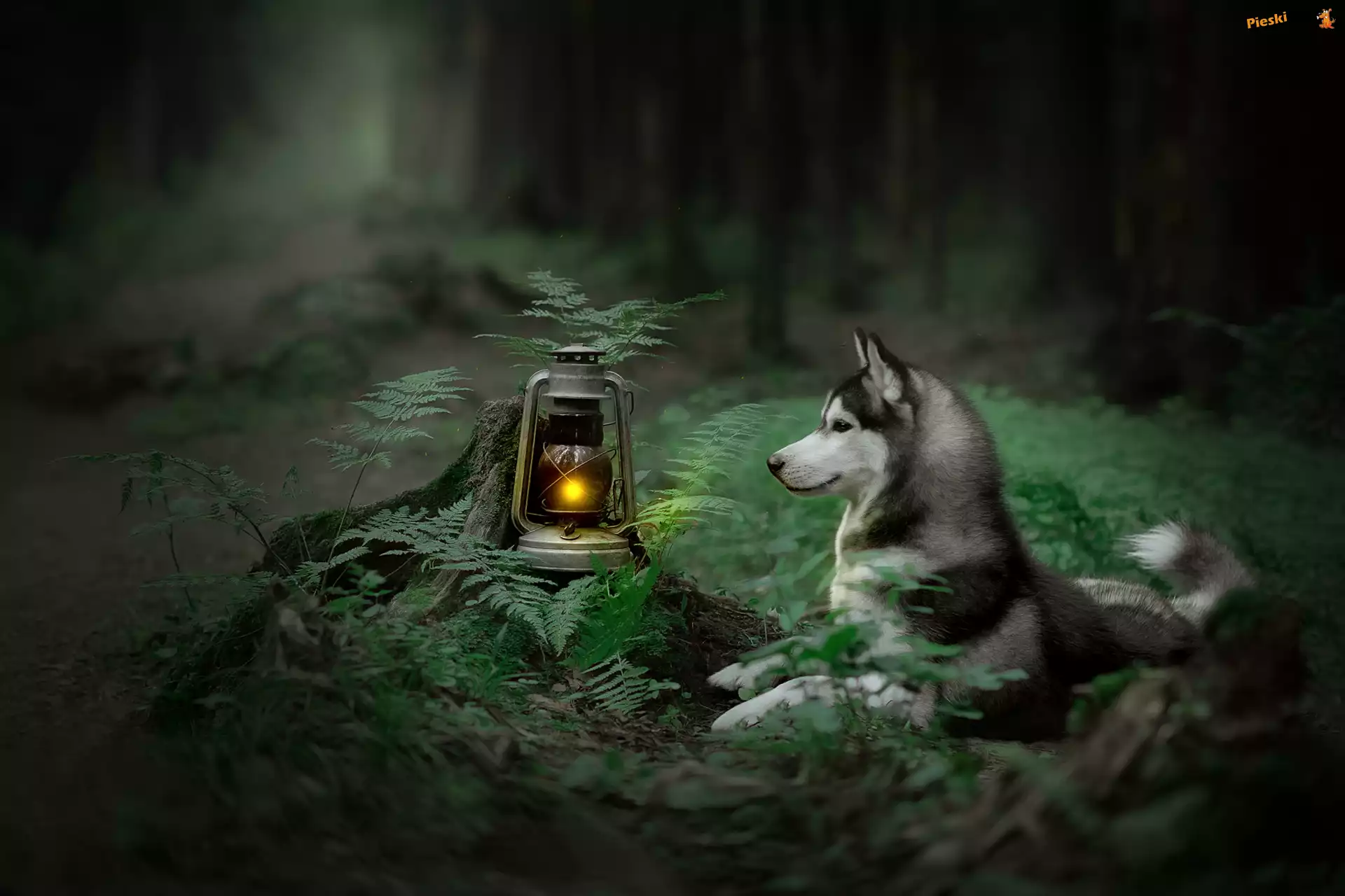 Siberian husky, Pies, Paprocie, Lampa naftowa