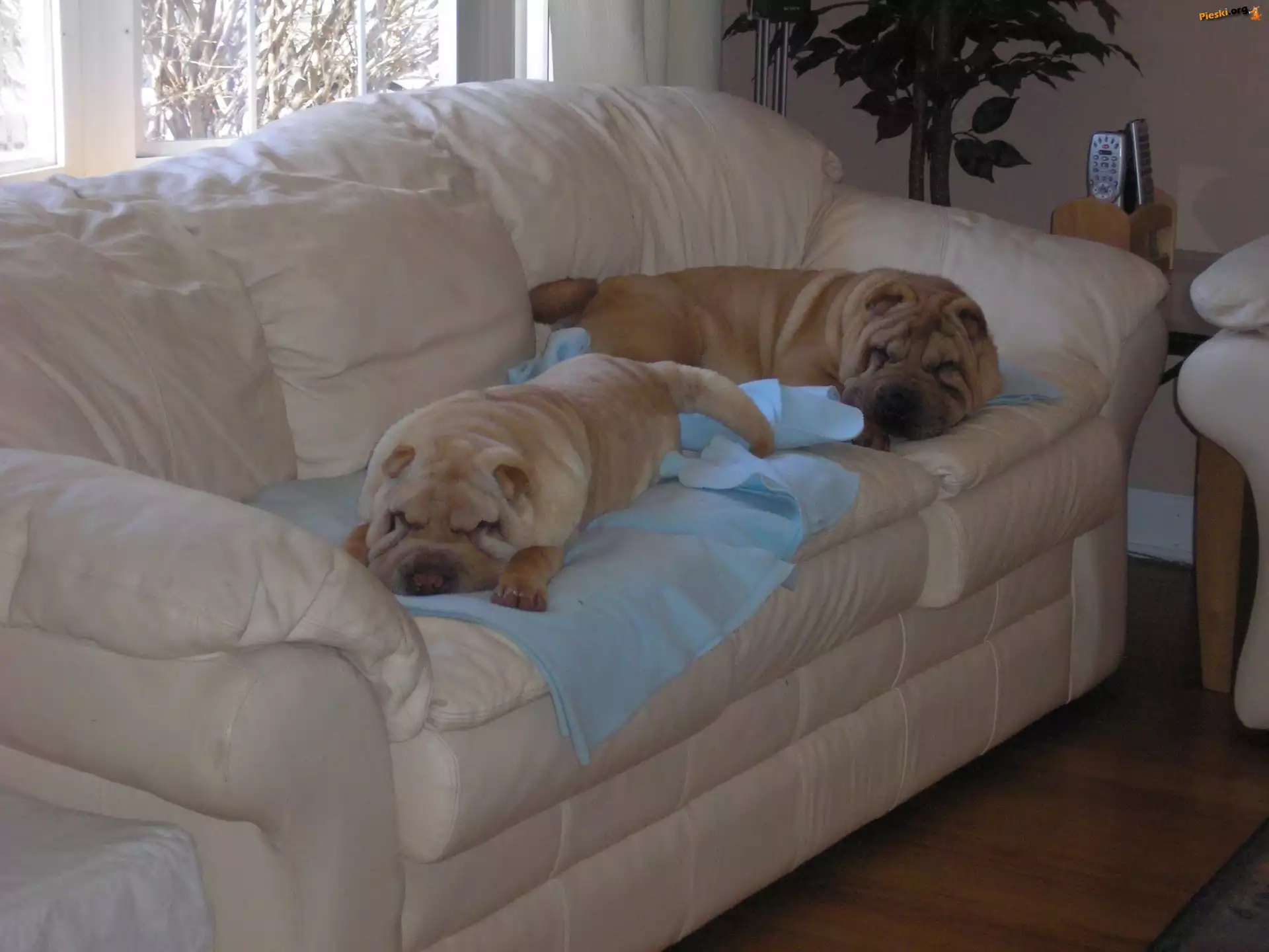 skórzana, Shar Pei, dwa, jasna, sofa, Pieski