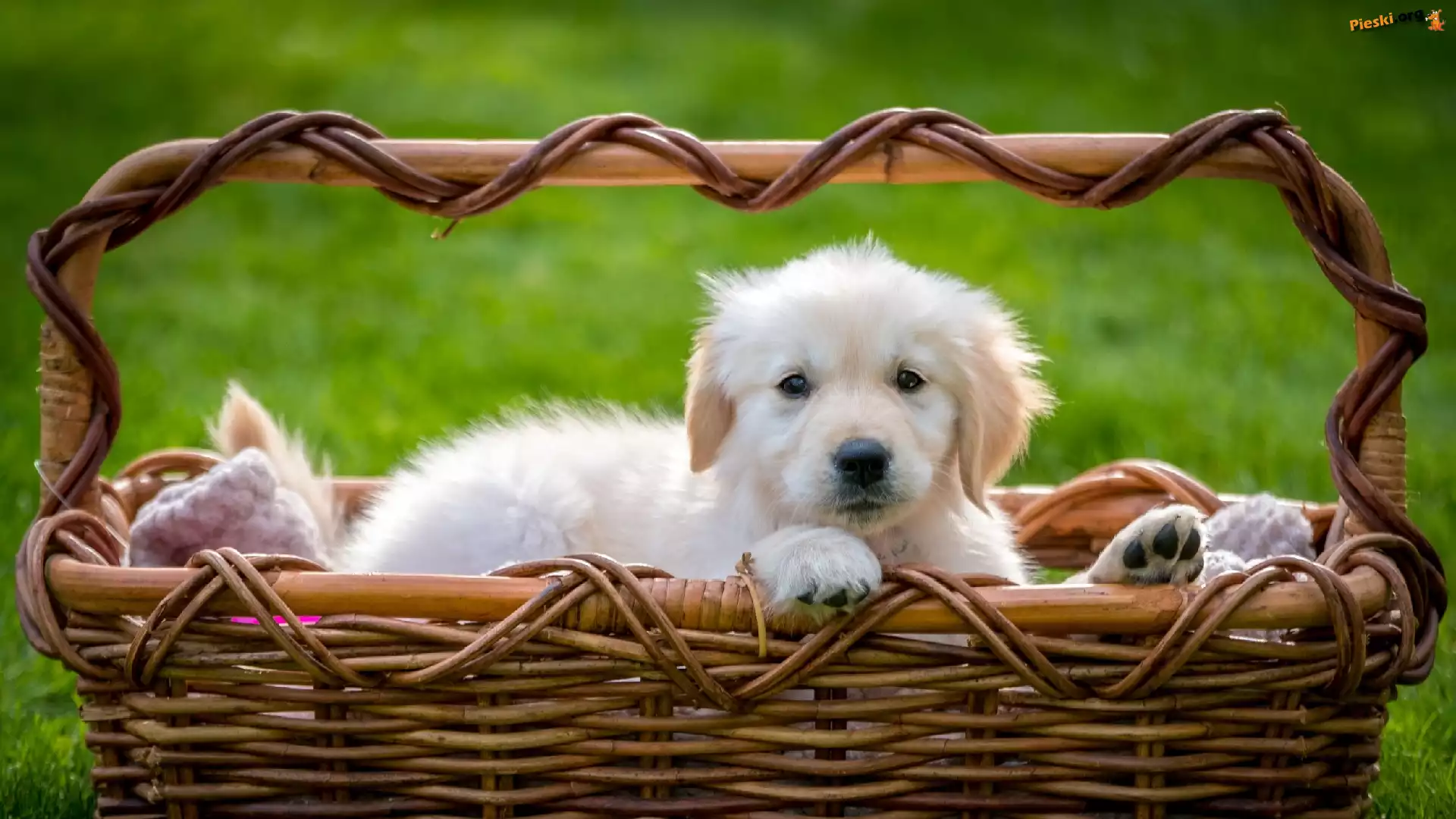 Szczeniak, Golden retriever, Koszyk, Pieski