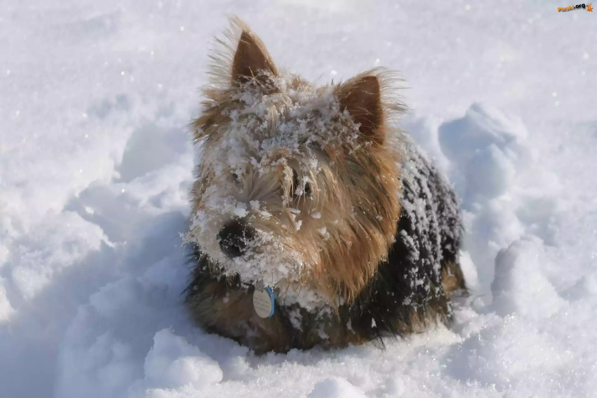 Piesek, Norwich terrier Norwich terrier czarno-rudy, Norwich terrier Pies, Czarna, Obroża Norwich terrier, śnieg