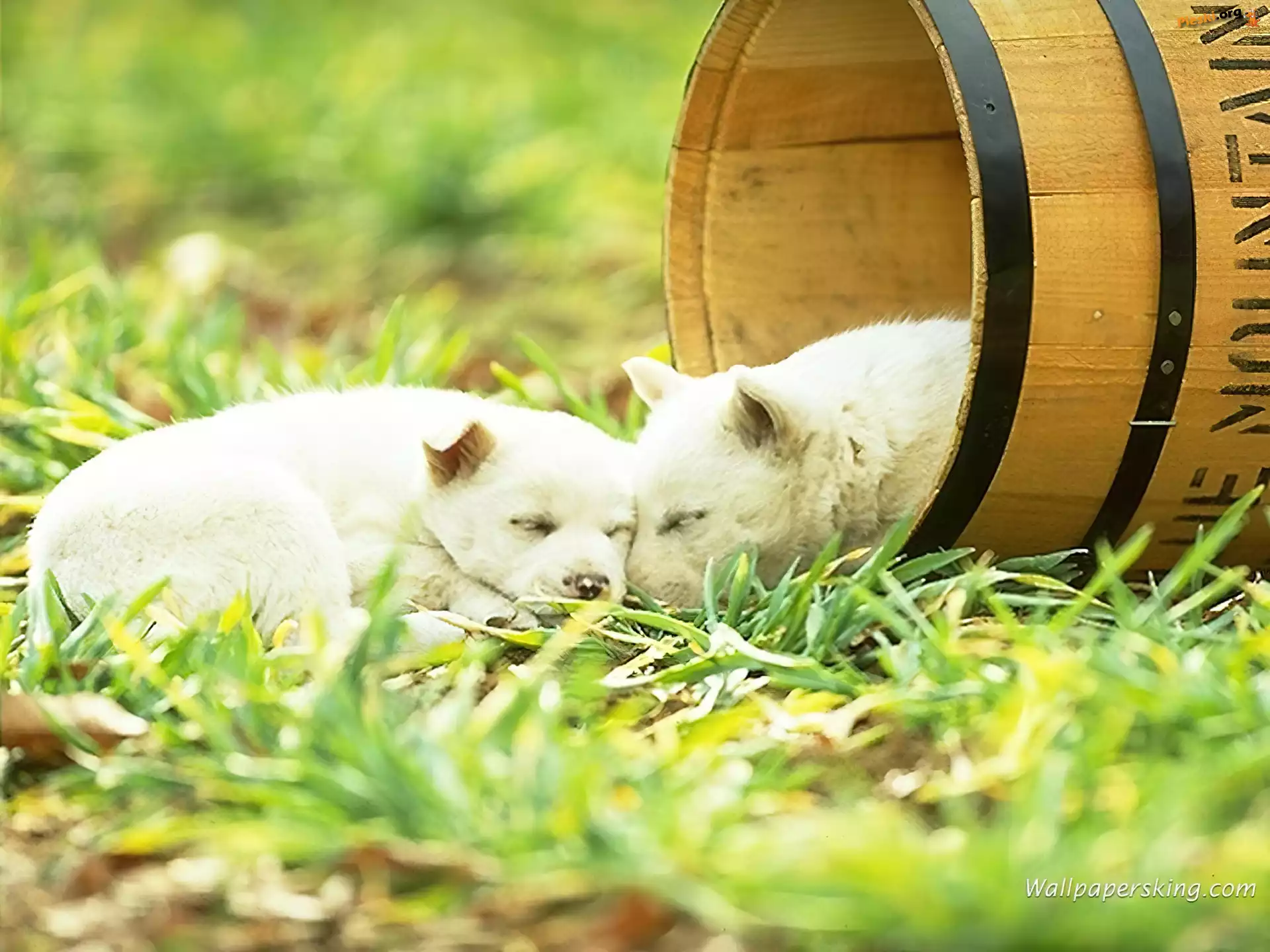 beczka, trawa, Psy, szczeniaki