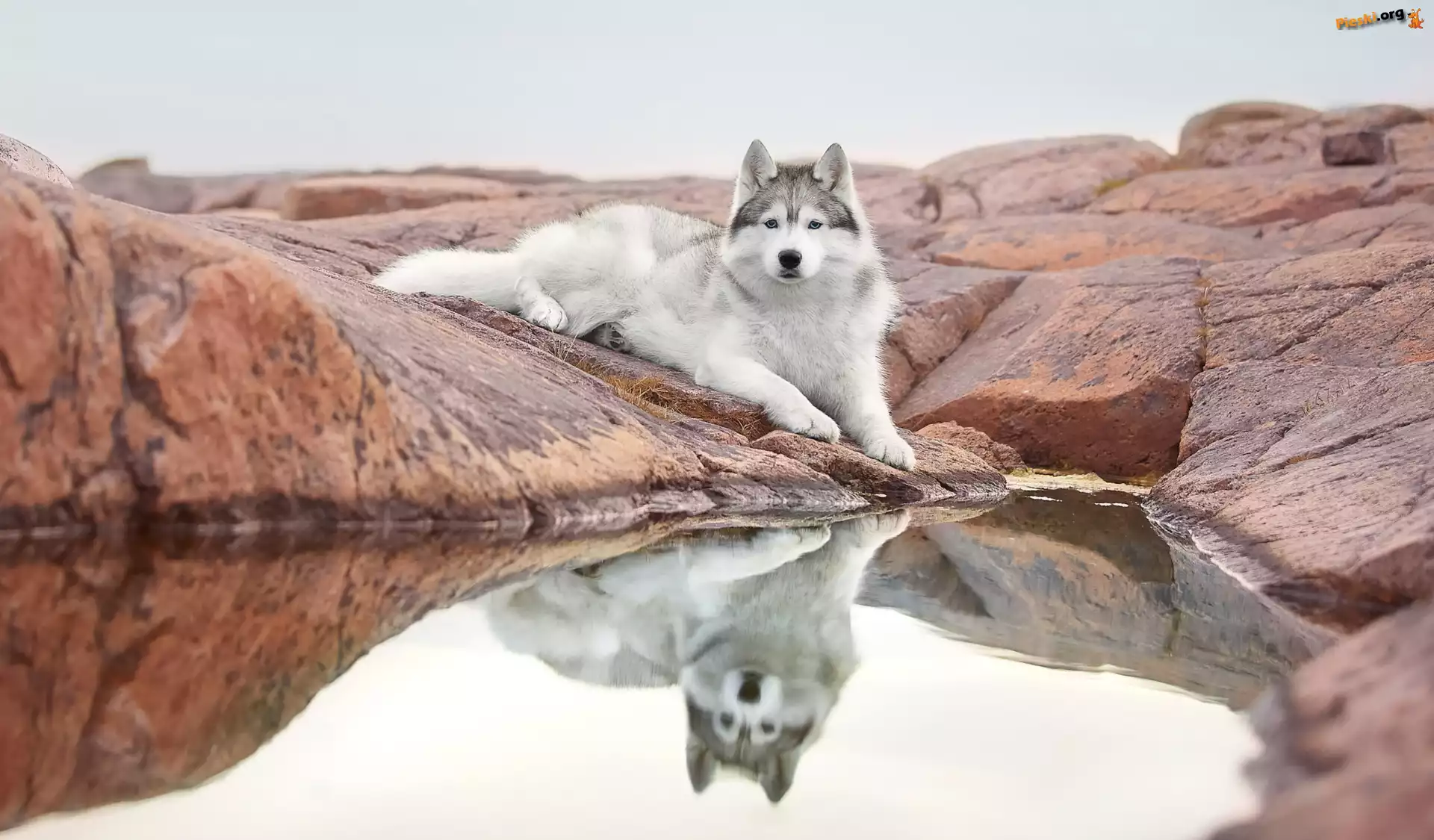 Leżący, Woda, Skała, Pies, Siberian husky, Odbicie, Pieski